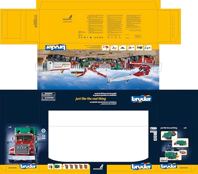 - MACK Granite Garbage truck, item no. 02812, with dimensions of approximately 27.4 inches × 7.3 inches × 10.4 inches