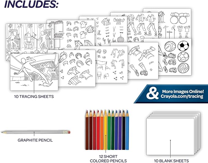 • CRAYOLA LIGHT UP TRACING PAD: The Crayola Light Up Tracing Pad art kit includes 1 Graphite Pencil, 12 Short Colored Pencils, 10 Tracing Sheets, and 10 Blank Sheets. (3 AA Batteries Required. Sold Separately).