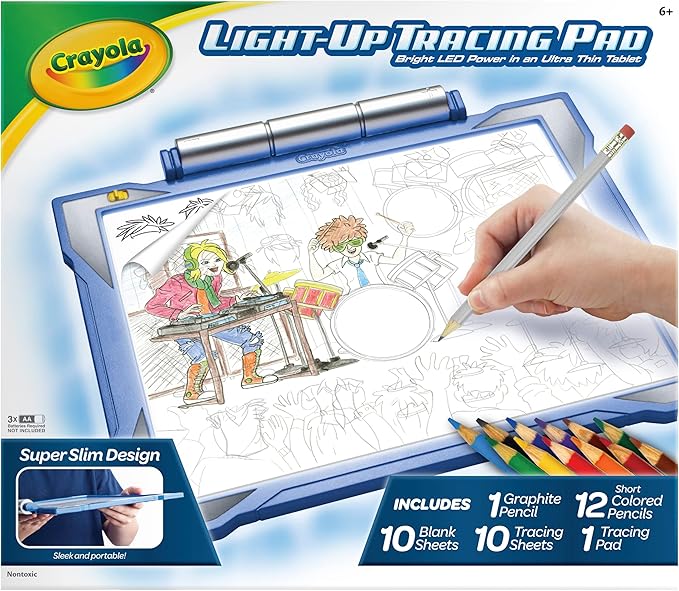 • CRAYOLA LIGHT UP TRACING PAD: The Crayola Light Up Tracing Pad art kit includes 1 Graphite Pencil, 12 Short Colored Pencils, 10 Tracing Sheets, and 10 Blank Sheets. (3 AA Batteries Required. Sold Separately).