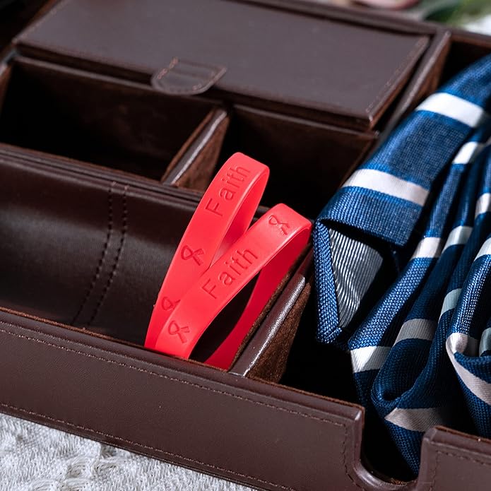 - STRONG SILICONE BAND: Each silicone bracelet is made to fit comfortably while not restricting blood flow. Each Red awareness bracelet is made of high quality non-toxic, eco-friendly 100% silicone. This AIDS/HIV Awareness bracelet is adult size, measuring 8 1/4 inches in circumference and reads "Hope, Faith, Love" on the outside.