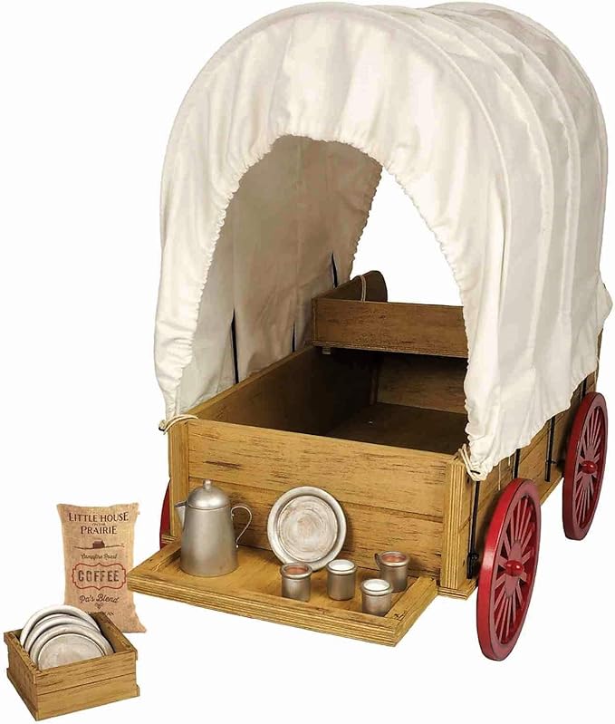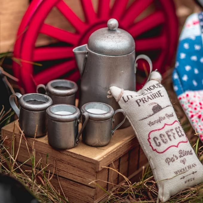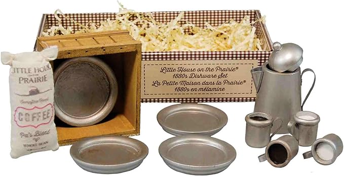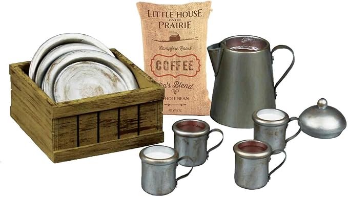- 12 piece set includes 4 plates, coffee pot, 2 cups of coffee for Ma and Pa, 2 cups of milk for Mary and Laura, sack of coffee, and wooden crate for storage.