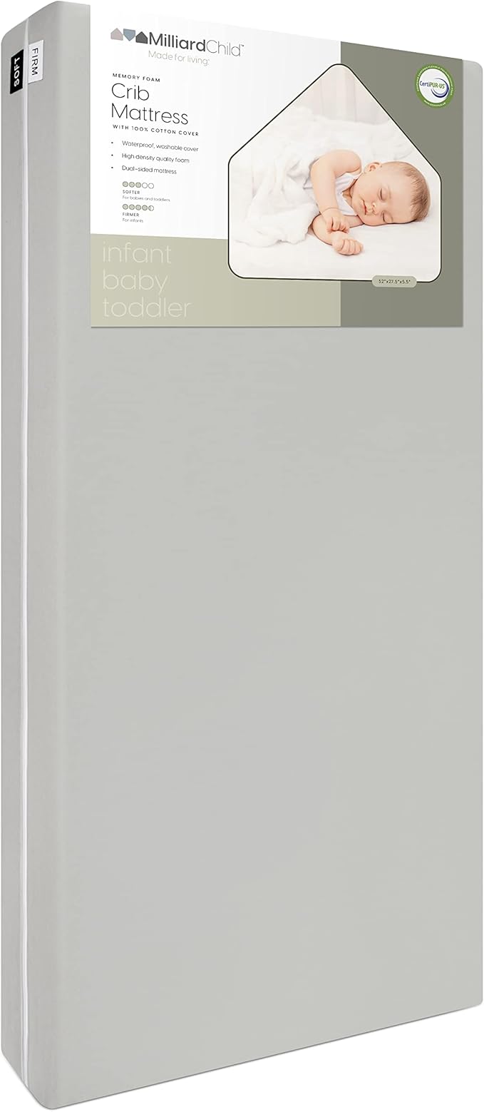 Milliard Memory Foam Crib Mattress, New Edition, Flip Technology, Firm Side for Baby and Soft Side for Toddler - 100% Cotton Cover, Made in The USA, 5.5x52x27.5 in.