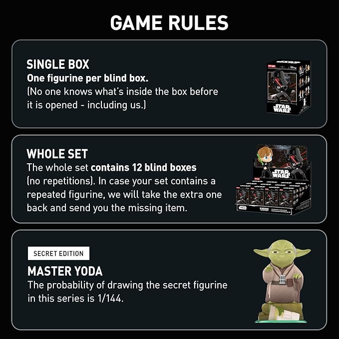 - POP MART Star Wars Series Figures: The blind box contains a random figure from a specific series. Each blind box only contains one figure. No one, including us, knows what's inside. This collection contains 12 blind box figures, one of them might be the secret edition.