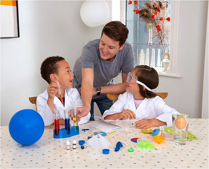 - Contains 3 test tubes and rack, goggles, bouncy ball mold and crystals, magnifying glass, spinner, slime pot, squishy eyeballs, 3 food colorings, petri-dish, pH scale and paper and much more