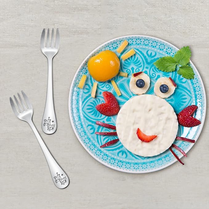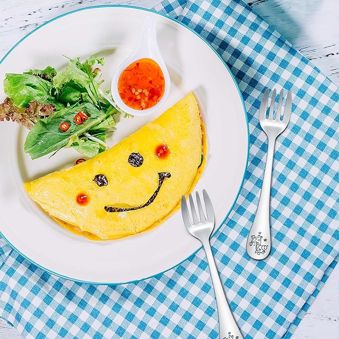 - √ NICE SIZE - This kids fork set is perfect size and weight for balanced grip, Perfectly fits kids small fingers, Stainless steel material makes it look like grown-ups forks to encourage kids to independently eat
