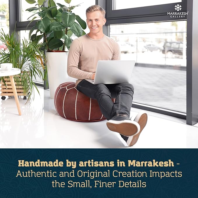 - Handcrafted by Artisans in Marrakesh - Made from 100% genuine soft leather, this Round Leather Cover pouf ottoman features exquisitely detailed, hand-stitched embroidery with a unique design down to the finest details