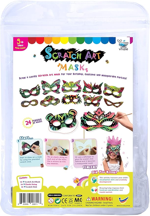 - [SCRATCH PAPER ART MASK]: Scratch Paper Art Mask Set is a creative and fun activity for kids 5 years and older. The paper is multi-colored with a black coating on top. Remove the coating with the included scratch tool to reveal stunning rainbow colors hiding beneath the surface.