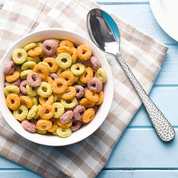 - PERFECT SIZE- Customized mini size to fit toddler’s hand and mouth, Hammered pattern gives a shiny glow to catch toddlers’ attention, Proper thin fork tines make it easy for kids fork soft food by themselves, suggest for 24 months +