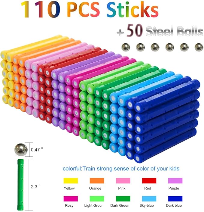 - ⛳Colorful Construction Toys: All sticks are colorful, to improve different thinking ability, problem solving skills, symbolic thinking and sense of color of your kids. Acquire geometrical shapes including 3D forms numbers counts, magnetic polarities & architectural design. Inspirational, Recreational, Educational, Conventional Toys. Not only for child, also great for you to build up a positive relationship with your little ones in an environment of fun