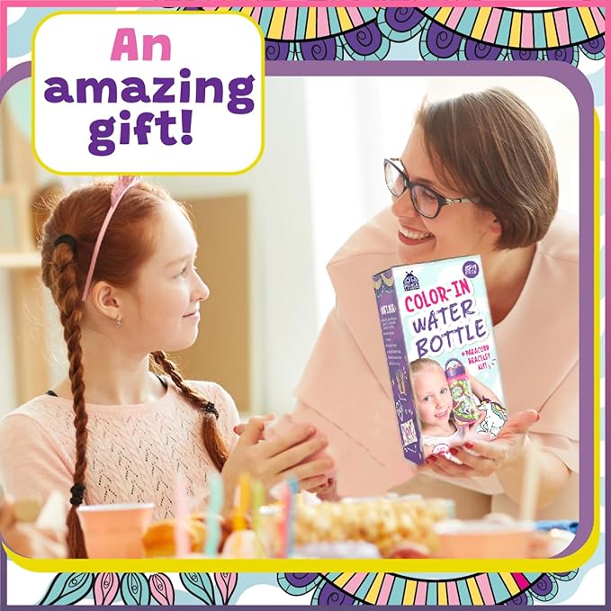 - COMPLETE CRAFT KIT! Color your own water bottle for girls comes with fun pre- printed unicorn design, 10 vibrant permanent coloring markers, 1 sheet of gem art stickers, and a carabiner to hang the bottle. Plus, we include a bonus pencil case ready to be colored in and a paracord bracelet kit.