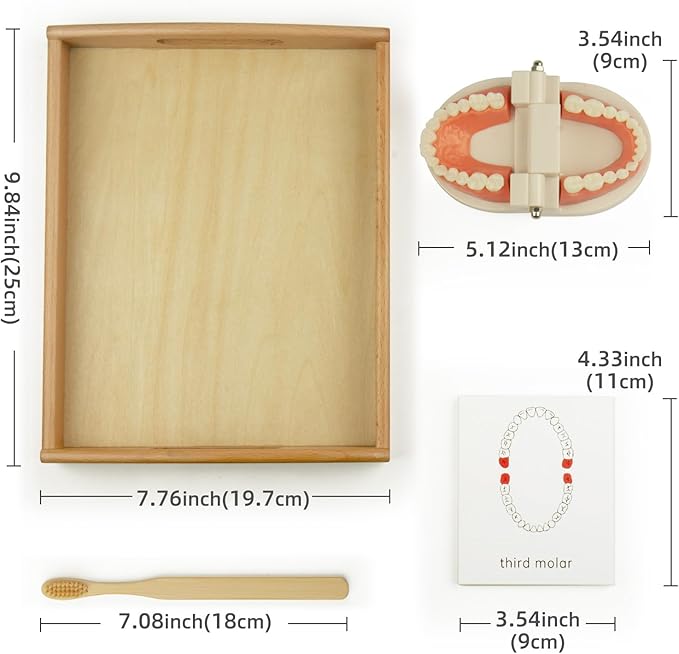 - Montessori Materials – include 1 pcs wooden tray, teeth Model,toothbrush and Dental cognitive Cards.