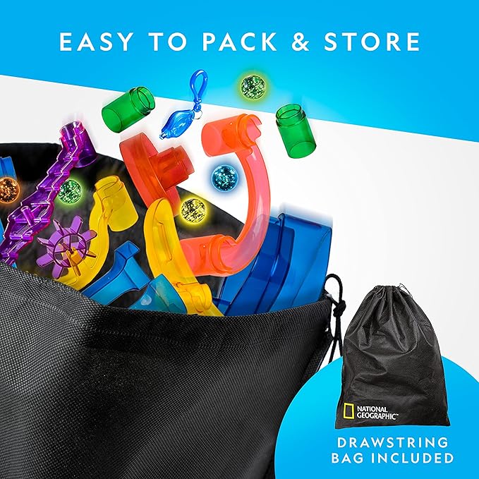 NATIONAL GEOGRAPHIC Glowing Marble Run – 250 Piece Construction Set with 50 Glow in The Dark Glass Marbles & Storage Bag, STEM Gifts for Boys and Girls, Building Project Toy (Amazon Exclusive)