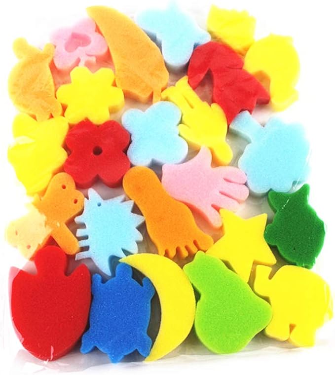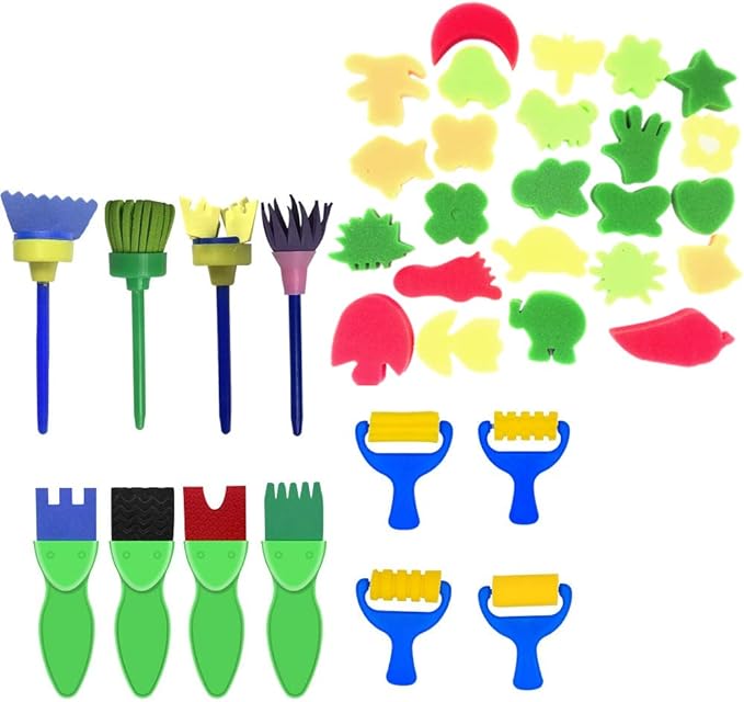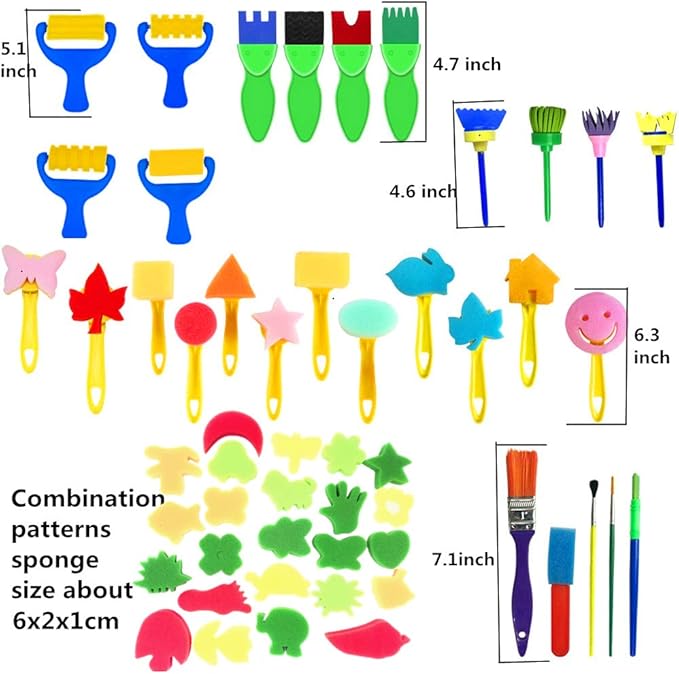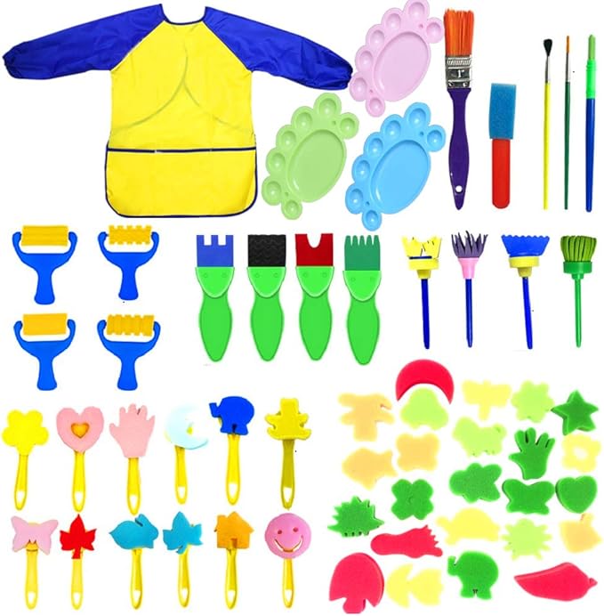 - Super Package :57 pieces paint brushes for kids include--1 x Long Sleeve Waterproof Apron,12x different Pattern Sponge Brush with handle,4 x Stamp flower painting brushes,4 x Roller sponge brushes ,4 x Texture sponge brushes, 24 x Combination patterns (maybe different from image but we guarantee 24 different patterns),2x Paint Brush,2 x Fine brush,1 x Sponge shovel, 3 x Paint Tray Palettes