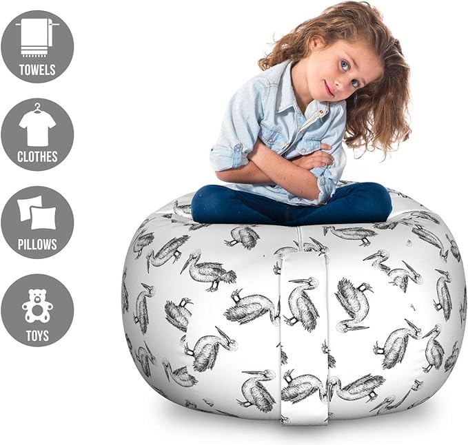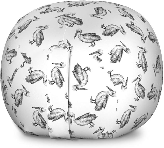 Lunarable Pelican Storage Toy Bag Chair, Pattern of Animals in Hand Drawn Sketch Style Monochrome Birds Print, Stuffed Animal Organizer Washable Bag, Large Size, White Black