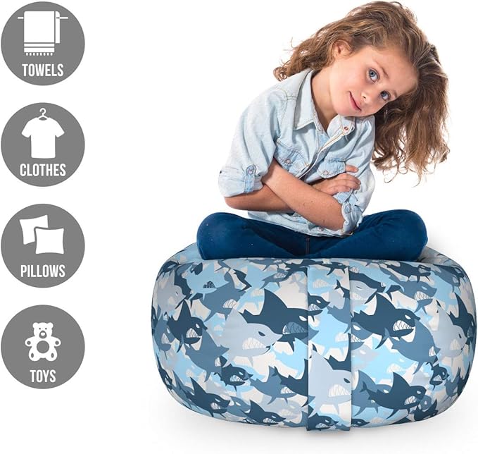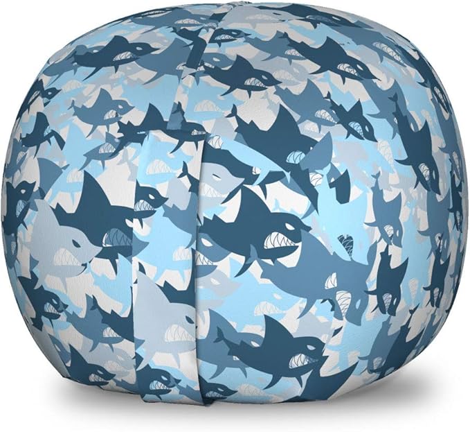 Lunarable Sea Animals Storage Toy Bag Chair, Camouflage Pattern with Aggressive Shark Fishes Scary Marine Predators, Stuffed Animal Organizer Washable Bag, Small Size, Blue Grey