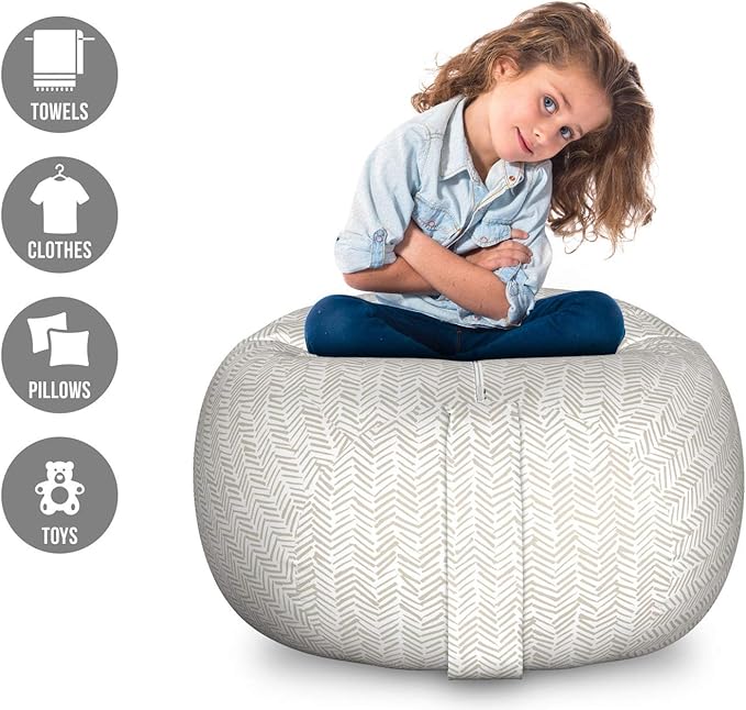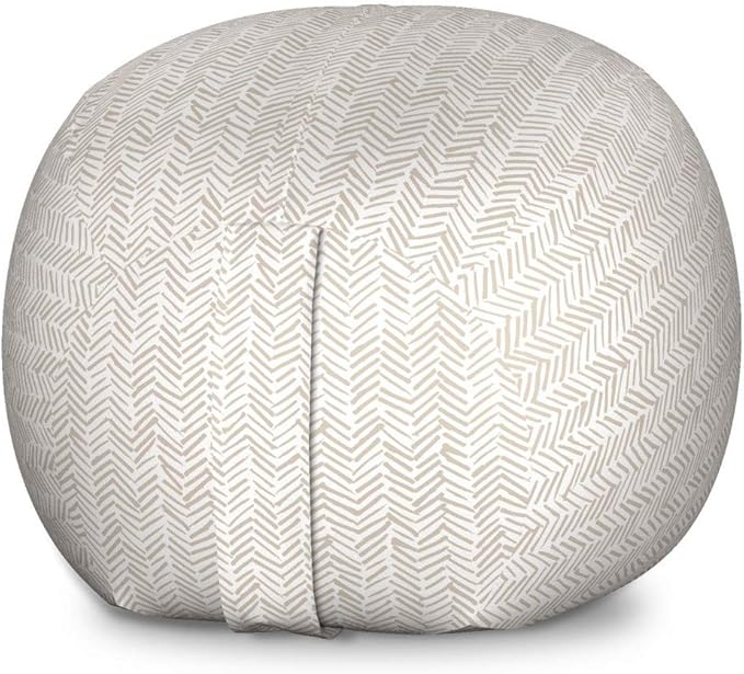 Lunarable Chevron Storage Toy Bag Chair, Hand Drawn Monochrome Herringbone Lines Composition of Abstract Zigzags, Stuffed Animal Organizer Washable Bag, Large Size, White Beige