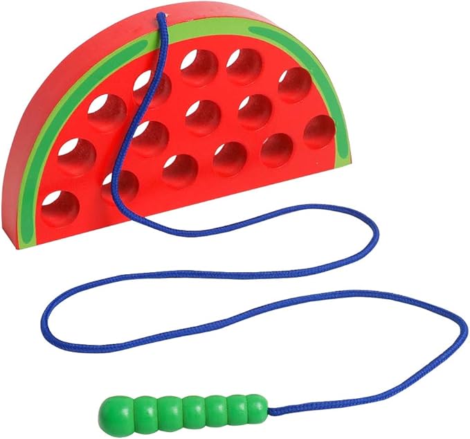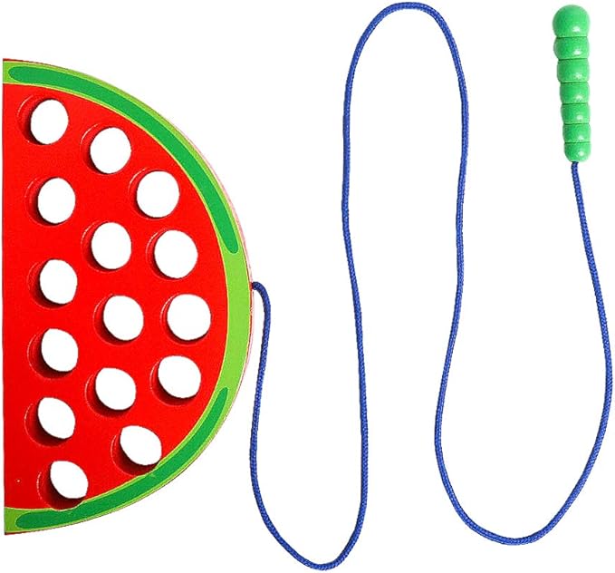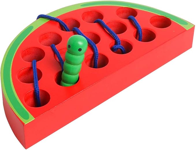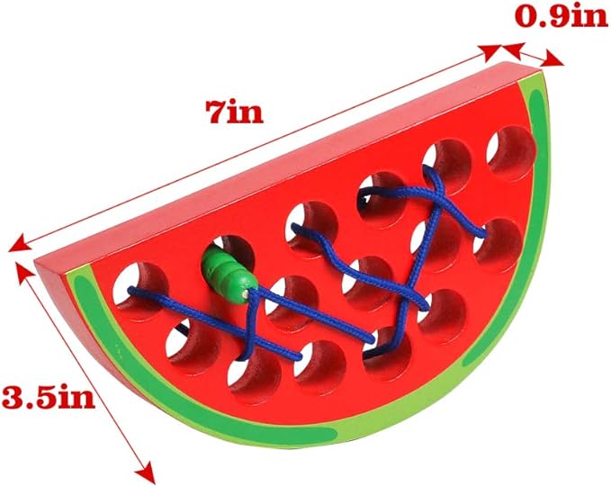 - FUN AND CREATIVE: The Wooden Lacing watermelon Toy is a simple, vivid red watermelon with smooth holes and green peel look so much delicious, let the hungry caterpillar eat it sooner. Help the string-attached caterpillar munches through the watermelon by threading in and out. Perfect for training and developing personal skills.