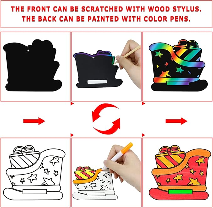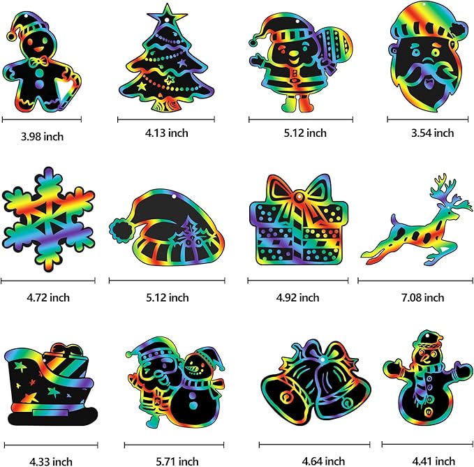 - The rainbow of colors will appear when you scratch. In Santa, Reindeer, Snowflake, Christmas Tree and so on, these ornaments will add some homemade holiday cheer.