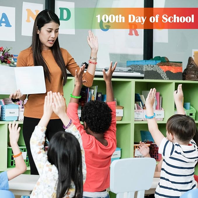 - Assorted color: come in an assortment of vibrant colors and features delightful HAPPY 100th Day, these silicone rubber bracelets are fantastic for adding that extra touch of cheer to any outfit