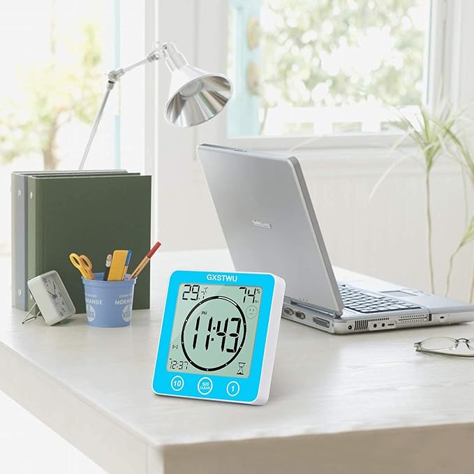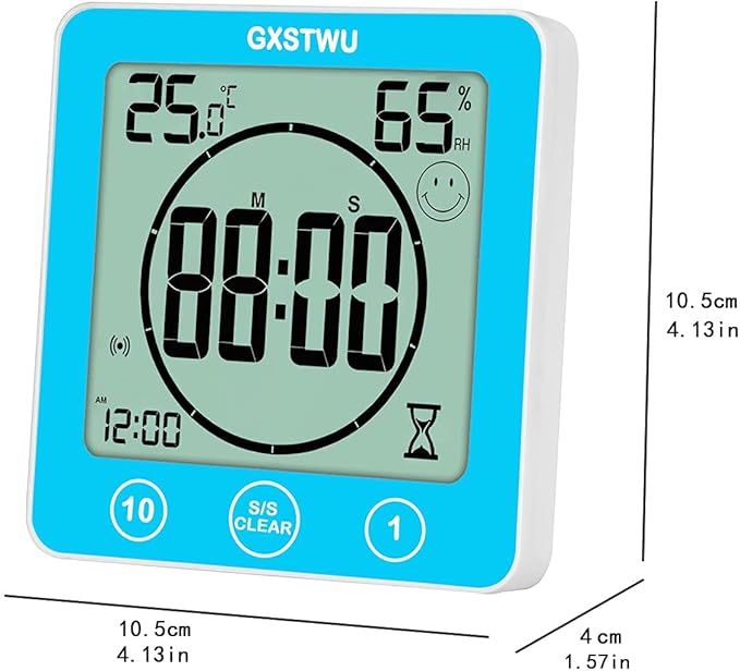 Digital Shower Clock, Bathroom Timer Clock, Waterproof for Water Spray, Count Up Count Down Alarm, Touch Screen Timer, Temperature Humidity, Wall Clock Magnet, Suction Cup, Hanging, Stand Blue