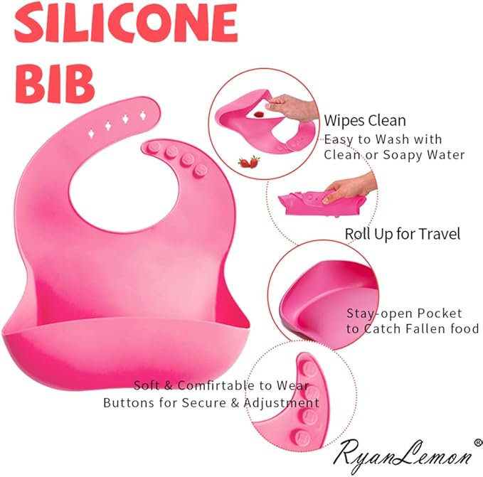 RyanLemon Baby Feeding Set, Baby Flatware Sets, Silicone Baby Led Weaning Set, Suction Plate and Bowl, Pocket Bib, Spoon Fork, Toddler Flatware Set for Babies 6 Months+, Dark pink