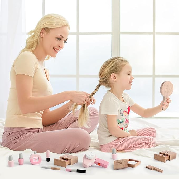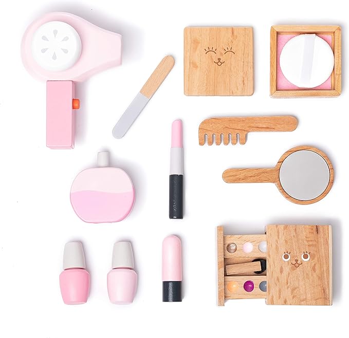 - 💄【HIGH QUALITY & DECORATION】Now your little girl can get ready just like mommy, Premium quality materials makes this toy beauty set long-lasting and durable, Each piece is made from 100% real wood