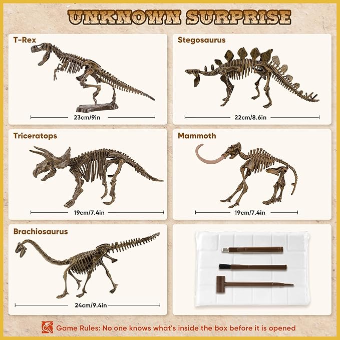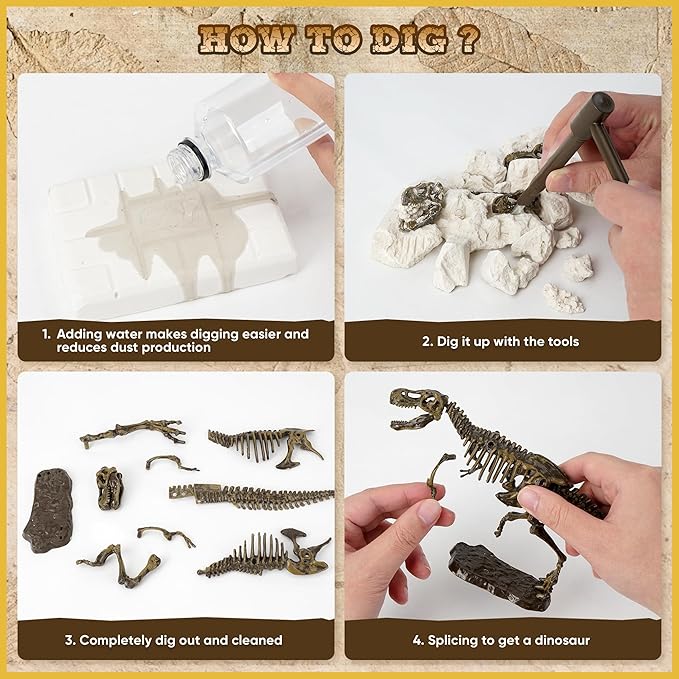 - Quality Materials: Dinosaur fossil digging kit for kids are made of durable vinyl and sheetrock, enough to keep your child occupied for hours, prepare before you start by wetting the sheetrock with water ahead of time to make digging easier