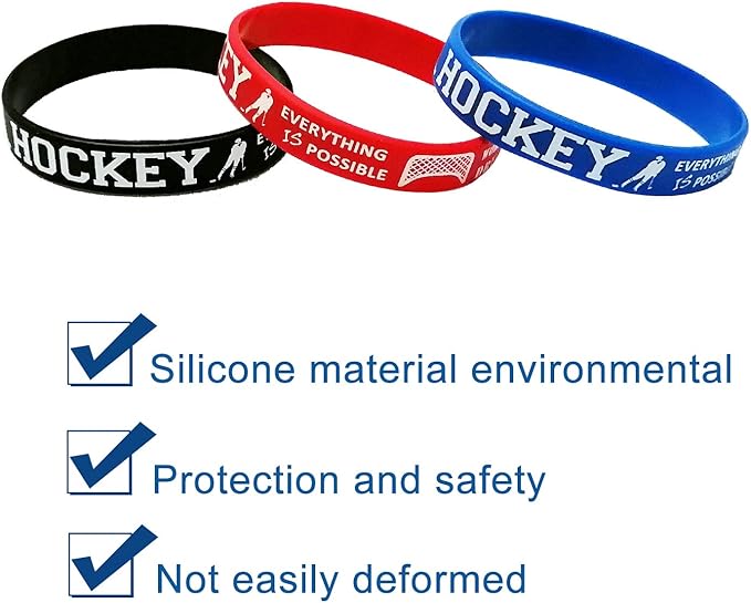- Motivational design - This hockey themed rubber bracelets are printed with motivational saying of "HOCKEY", "VICTORY", "ANYTHING IS POSSIBLE'',"DREAM BIG." ,"CHAMPION" ,"WORK HARD" and image of hockey,hockey net,skates.