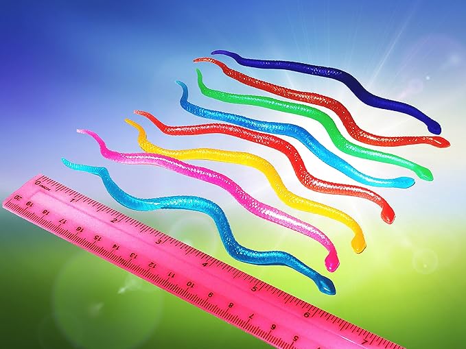 - Every mini snake measures 6 inches. These flexible action figure snakes are highly detailed, realistic-looking, colorful, and lifelike. This mini animal playset is made with environmentally friendly non-toxic materials. Each stretchy toy is individually wrapped, and all are packed in a highly resistant zipper bag. Each wrap contains a safety warning, so these stretchy rubber toys can be well used as piñata, Easter egg, goodie bags, or Halloween treat bags fillers.