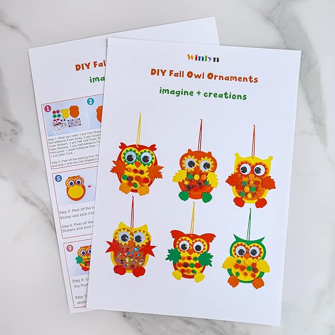 - Foam Owl Decorations DIY Owl Fall Craft Kit, including 24 pcs 6 owl foam shapes features little owl, barn owl, long-eared owl, eagle owl, short-eared owl and tawny owl, each shape has 4 pcs. 180 pcs fall cutouts foam stickers self-adhesive features maple leaves, oak leaves, birch leaves, hawthorn leaves, sunflower, pumpkin, 50 pcs black googly eyes, 120 pcs tinsel pom-poms, 120 Pcs yarn pom-poms, 24 Pcs satin cords, 1 sheet artificial sparkling gems stickers. 1 pc step-by-step instructions.