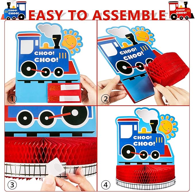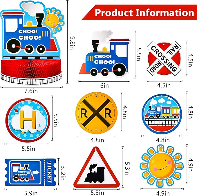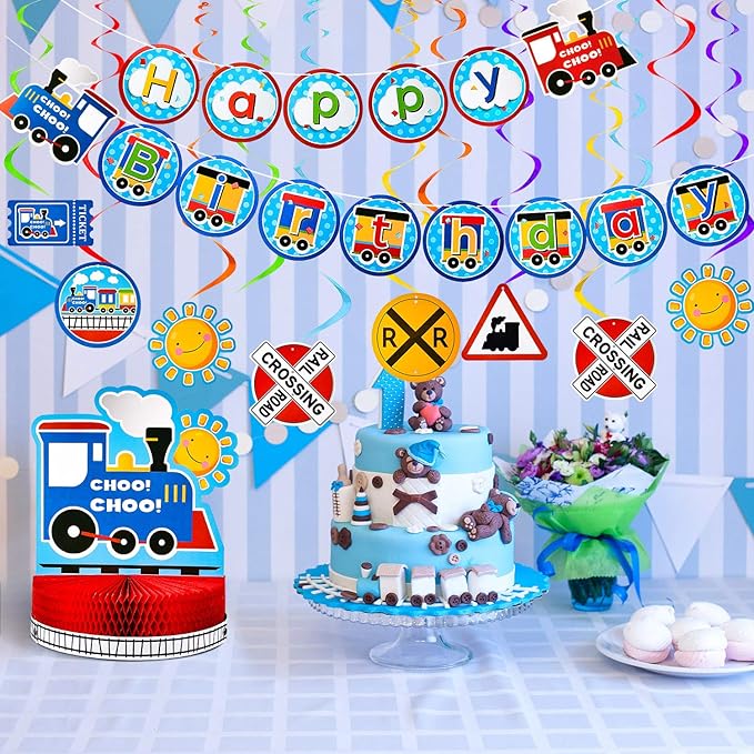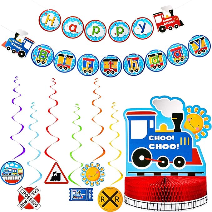 - What you get: the train birthday party decorations set includes 1 piece train honeycomb table centerpiece, 1 piece birthday banner, 6 pieces hanging swirl decoration, this novelty combination can catch people's eyes easily, enough quantities and diverse pattern can meet your party decoration needs