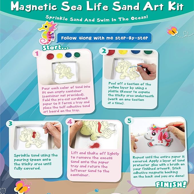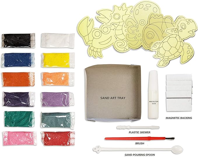 - [PACKAGE] Includes 5 X Sea Life Sand Art Board, 12 X Assorted Colors Bags of Sand, 5 X Adhesive Magnetic Backings, 1 X Sand Art Tray, 1 X Sand Pouring Spoon, 1 X Sand Protector Glue, 1 X Plastic Skewer, and 1 X Brush.