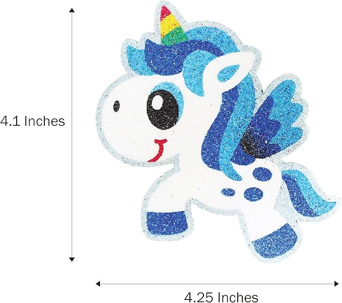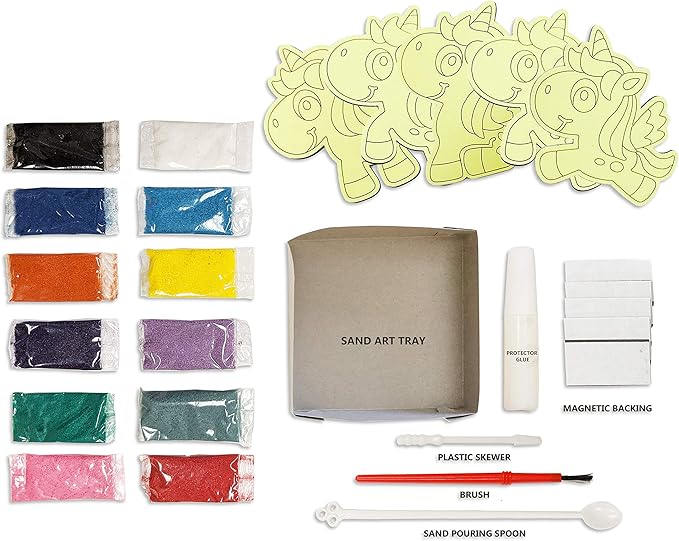 - [PACKAGE] Includes 5 X Unicorn Sand Art Board, 12 X Assorted Colors Bags of Sand, 5 X Adhesive Magnetic Backings, 1 X Sand Art Tray, 1 X Sand Pouring Spoon, 1 X Sand Protector Glue, 1 X Plastic Skewer, and 1 X Brush.