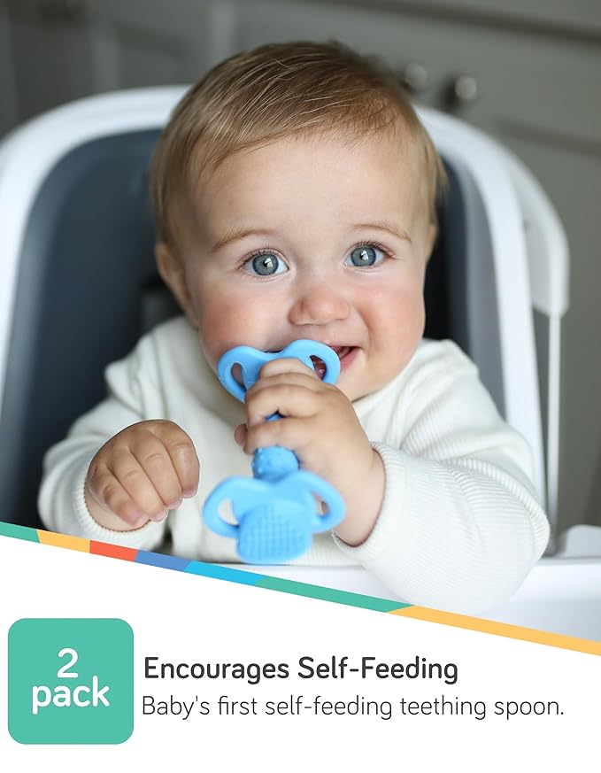 - Baby's first self-feeding teething spoon: encourages self-feeding, baby can explore new foods and textures.