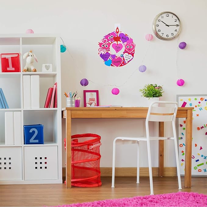 - Color: DIY Heart wreath bases are in red. Patterned heart stickers feature red, rose, pink, light pink, purple and white. Solid color heart stickers feature rose, pink, hot pink, and blue. Glitter heart stickers feature red and light purple. Heart tags are in red, pink, and hot pink. Satin cords are in red, rose, pink, purple, and light purple. Adhesive wall hooks are transparent.