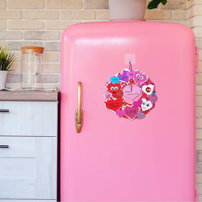 • Quantity: Heart Wreath Decorations DIY Foam Wreaths Craft Kit includes 12 pcs round foam wreath bases, 138 pcs heart foam stickers feature assorted patterns, 48 pcs heart foam stickers in 4 solid colors, 24 pcs glitter heart foam stickers in 2 colors, 12 pcs foam heart tags in 3 colors, 72 pcs black googly eyes, 12 pcs satin cords in 5 colors, 1 sheet of rhinestone stickers, 12 pcs adhesive wall hooks, and 1 pcs black marker pen.