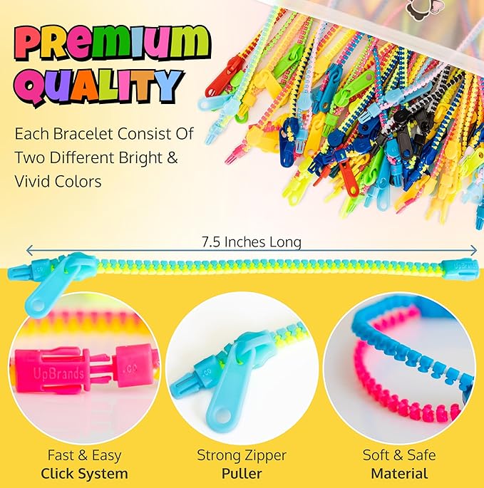 - Purchase with confidence: Enjoy a 30-day return policy if you need to return the product. We are committed to providing exceptional customer service, responding to inquiries within 24 hours. UpBrands Fidget Zipper Bracelets Pack is selling in bulk, so they have an excellent unit price compared to similar toys sold in vending machines at rates of 1 dollar or more.