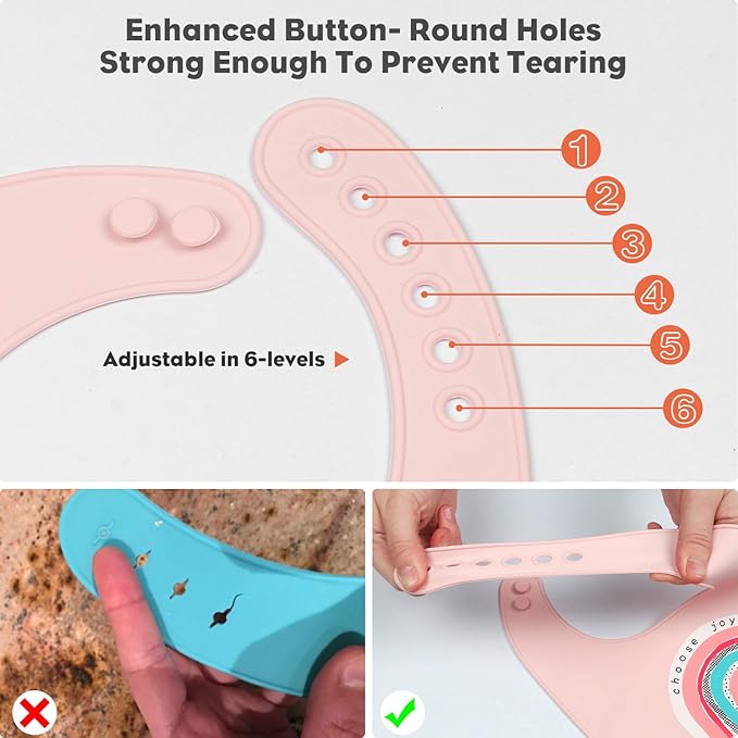 - 【Easy To Adjust】With 6 easy adjustable buttons, suitable for boys and girls aged from 4 month up to 3 years. The comfortable straps with the large neck radius will help your child's movement during eating. Roll up the flexible, memory-free bib for on-the-go dining; rescues clothes from endless spills and stains.
