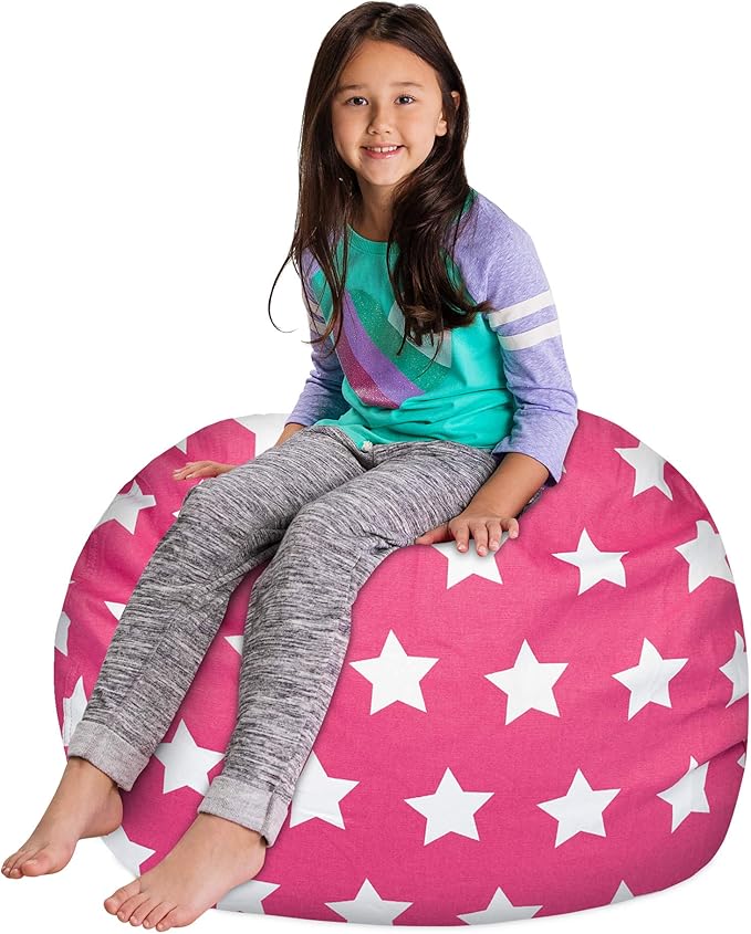 Posh Creations Kids Stuffed Animal Storage Bean Bag Chair Cover - Childrens Toy Organizer, Large-38in, Canvas White Stars on Pink