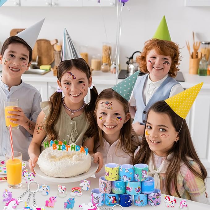 - A variety Colorful Unicorn Party Favors for Kids---the Unicorn party favors include bracelet, keychain, rings, and unicorn hair rings, stickers, tattoos, 133Pcs in all, it must be a big hit for all little girls. All the Unicorn party supplies will impress every party guest.