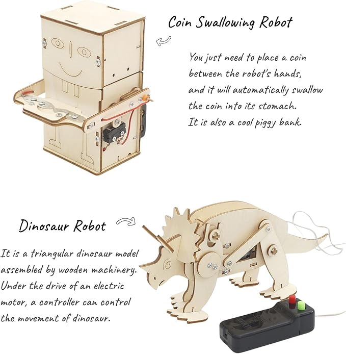 - Fun Activities: The robot kit provide perfect stem activities for kids. By assembling wooden puzzles, motors, circuits, gears, shafts and screws in our stem kits, children will learn basic STEM science and improve hand-on skills, enhance their self-confidence and creativity. Learning by Playing!