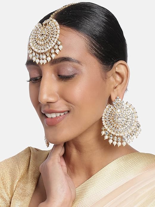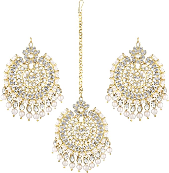 Aheli Ethnic Faux Kundan Drop Pearl Beads Dangle Earrings Maang Tikka Set Bollyood Fashion Jewelry for Women & Girls