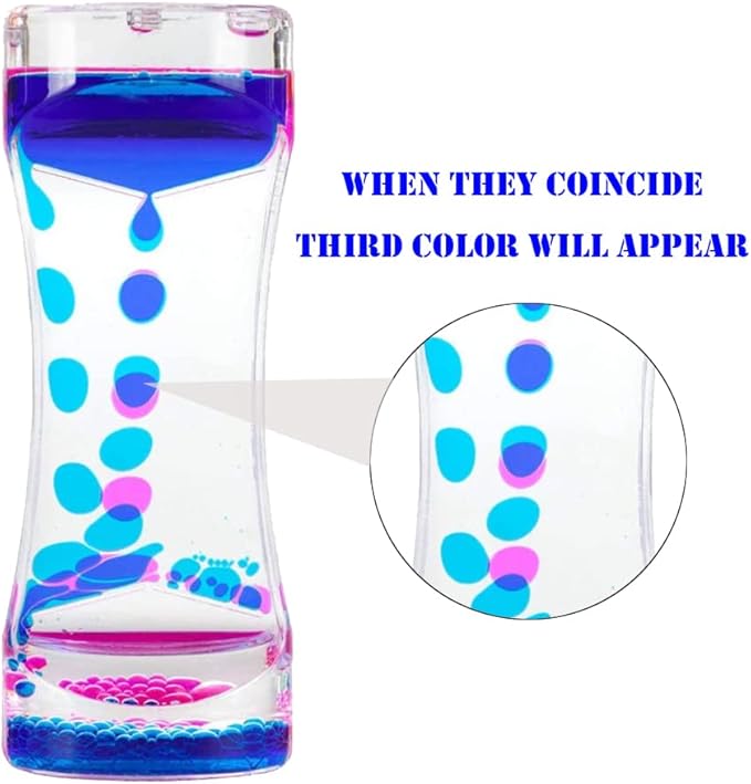 - Great and Fascinating Visual Effects: Great Colorful liquid motion timer is an excellent visual stimulant. It has a mesmerizing effect when you watch the bubbles travel down in slow motion. Each liquid motion bubbler timer contains 2 colors inside, When they coincide, a third color will appear, giving you a different sensory experience