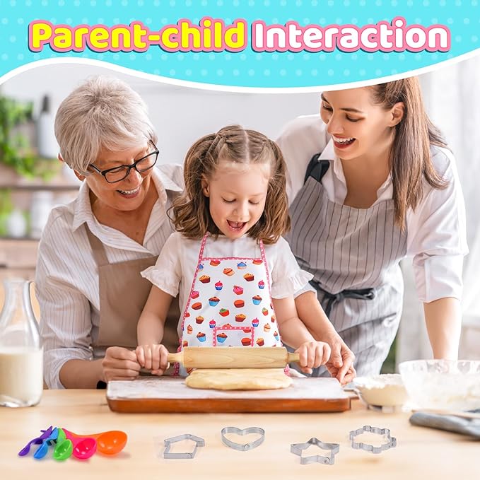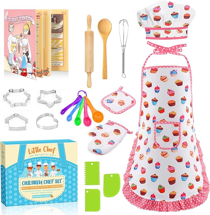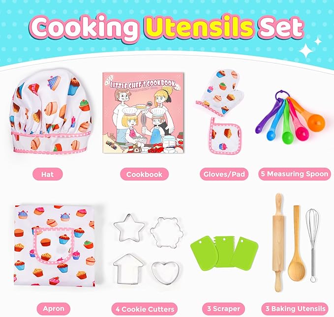 - COMPLETE 20PCS/SET: Includes Apron, Chef's hat, Cookbook, Oven glove, Insulation pad, Wooden spoon, Whisk, Rolling pin, 5 measuring spoon, 3 scrapers and 4 cookie cutters. With CPC certificate, passed CPSIA and ASTM standard tests, Completely meet kids' basic cooking and baking game needs!