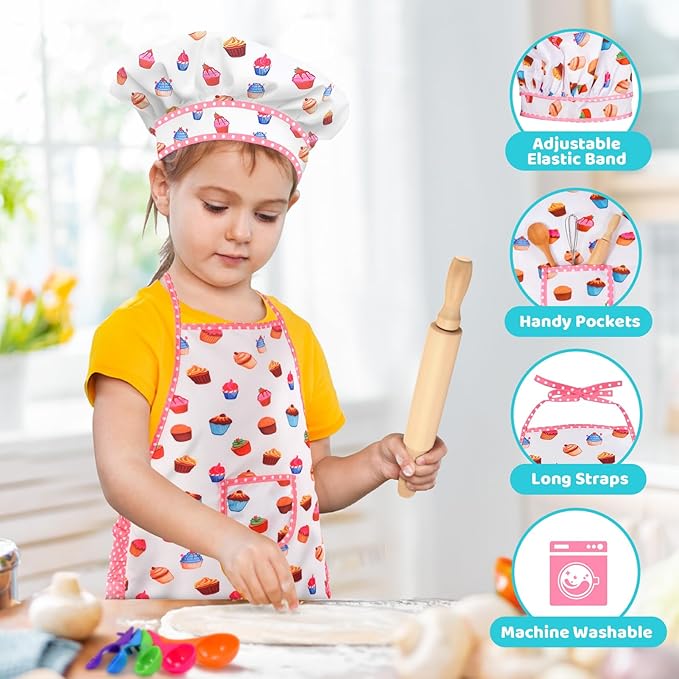 - FOR DIFFERENT AGED BOYS GIRLS: The chef's hat is elastic designed, and kids apron has long enough ropes to be tied around the neck and waist respectively, Applicable for most body type. Optional colors, kids cooking sets suitable for 3-12 years old boys girls.