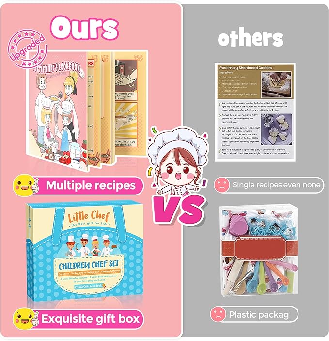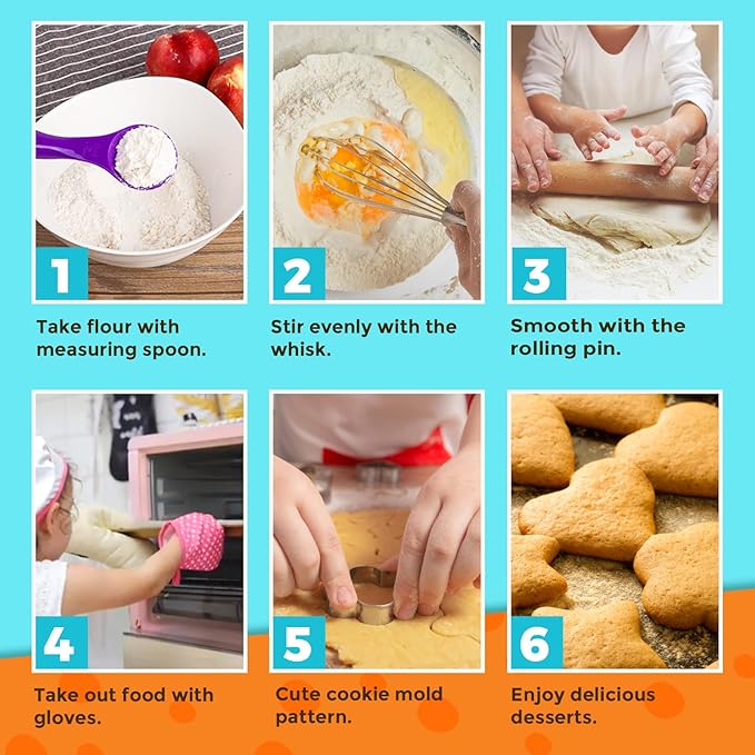 - COMES WITH COOKBOOK: Kids don’t know how to make food? Do not worry! kids baking set has a well-designed and bound cookbook, which introduces 10 kinds of food preparation methods through the most simple way of easy understanding pictures and texts. Correctly help children get started with cooking!