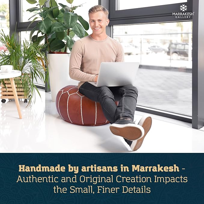 - Handcrafted by Artisans in Marrakesh - Made from 100% genuine soft leather, this Round Leather Cover pouf ottoman features exquisitely detailed, hand-stitched embroidery with a unique design down to the finest details