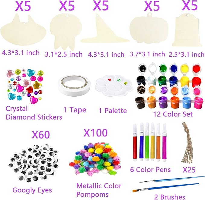 - 【DIY Halloween Crafts for Kids】- You will receive 5 types of Halloween wooden ornaments for kids crafts, 5pcs in each style, 25pcs in total; 12 colors of Paint, 6 colors of Pens, 100 Self-adhesive Eyes; 25 Ropes,1 sheet of Sticker, 1 Palette, 2 Brushes and other cute accessiores. Ideal Halloween arts and crafts for kids ages 4-8, 8-12.