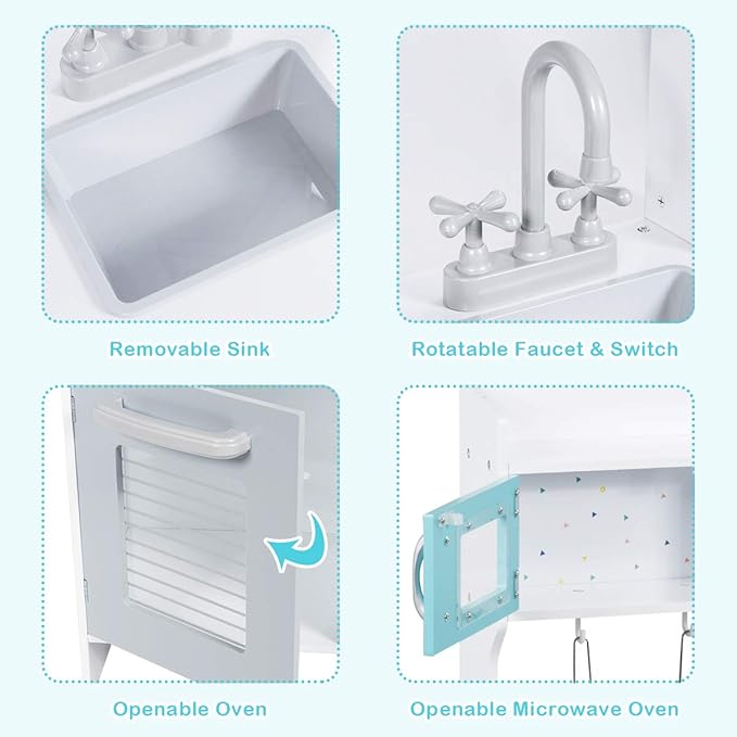 - 【Realize Kids’ Chef Dream】: This kids kitchen playset features modern style with attractive appearance, simulating the real-scale kitchen for more fun. This kids kitche toy set includes a pot and a pan, a spatula, spoon, a removable sink with rotatable faucet, stove, oven, microwave oven, 2 open shelves and a cabinet for condiments.