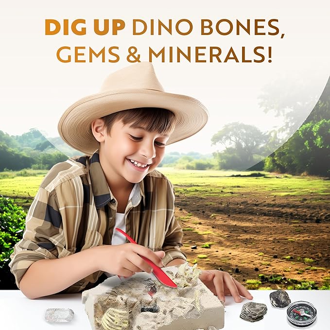 - DIG DINOSAUR BONES - Top-of-the-line learning & education dinosaur bones excavation kit and gemstone dig kit that creatively combine chemistry, physics, geology & more. Rebuild a triceratops, collect gemstones, study fossil rocks & more!